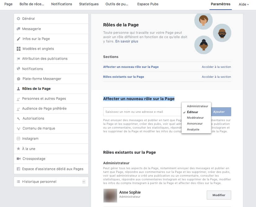 Pour ajouter un nouveau administrateur ou un éditeur sur : « Affecter un nouveau rôle sur la page » et choisissez un rôle (administrateur, éditeur, modérateur, annonceur, analyste) et enfin cliquez sur «Ajouter».