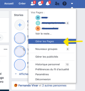 Une fois connecté à votre profil Facebook, allez dans le menu en haut à droite et cliquez sur la flèche. Un menu déroulant apparaitra, cliquez sur l’option « Gérer les pages ».