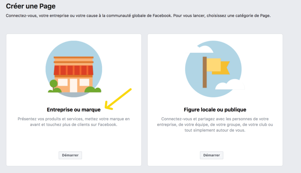 Une fois sur la page du lien, choisissez « Entreprise ou marque » puis cliquez sur « démarrer »